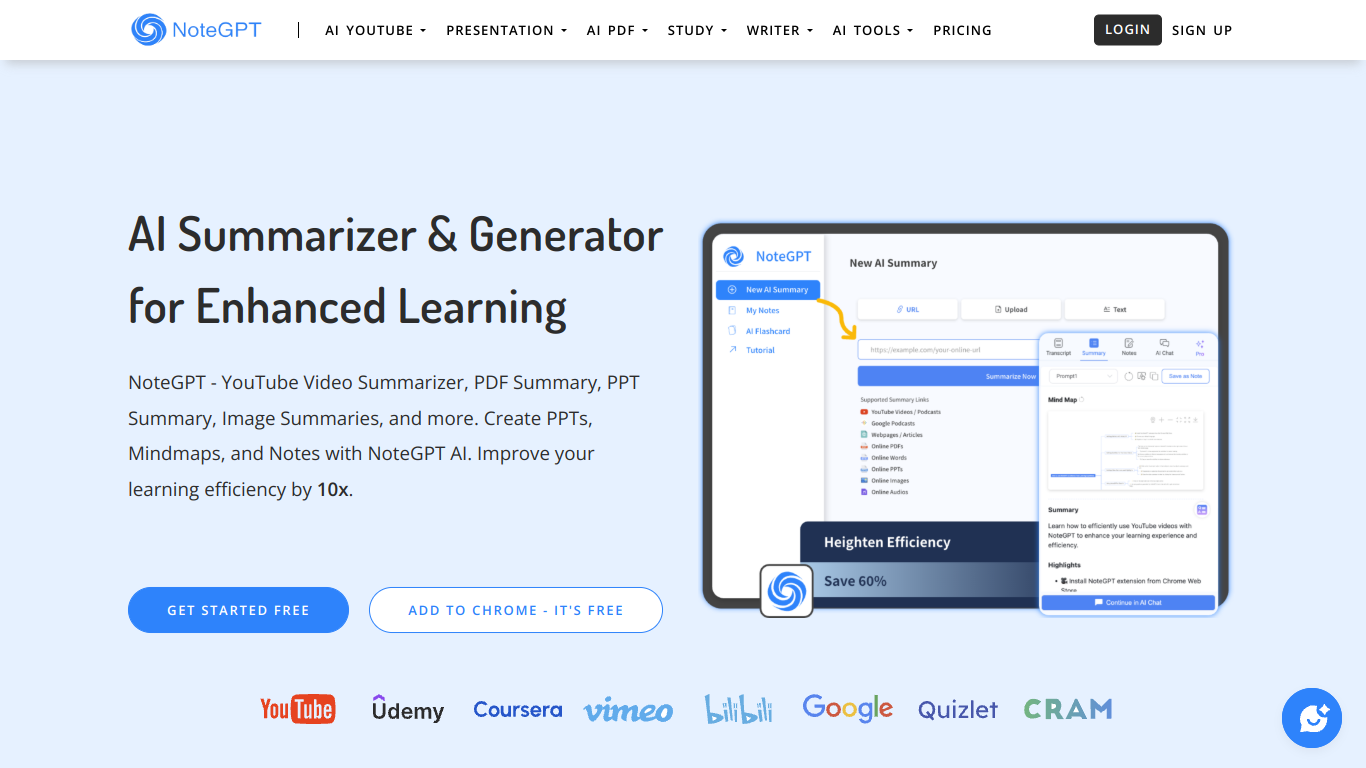 **NoteGPT** é uma ferramenta de **IA para anotações** e **resumos**, projetada para aprimorar o aprendizado. Com funcionalidades como **resumo de vídeos do YouTube**, **PDFs**, **PPTs**, **artigos**, e até **transcrições**, ela permite extrair e organizar informações de maneira eficiente.